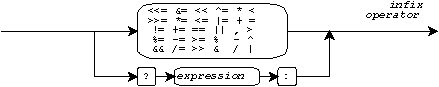 Add Assign · Add · Address of · Assignment · Bitwise AND Assign · Bitwise AND · Bitwise Exclusive OR Assign · Bitwise Exclusive OR · Bitwise Inclusive OR Assign · Bitwise Inclusive OR · Bitwise NOT · Comma · Conditional · Divide Assign · Divide · Equals · Function Call · Greater Than Or Equal · Greater Than · Indirection · Left Shift Assign · Left Shift · Less Than Or Equal · Less Than · Logical AND · Logical NOT · Logical OR · · Multiply Assign · Multiply · Not Equals · Plus · Point at · Postdecrement · Postincrement · Predecrement · Preincrement · Remainder Assign · Remainder · Right Shift Assign · Right Shift · Select · sizeof · Subscript · Subtract Assign · Subtract · Type Cast